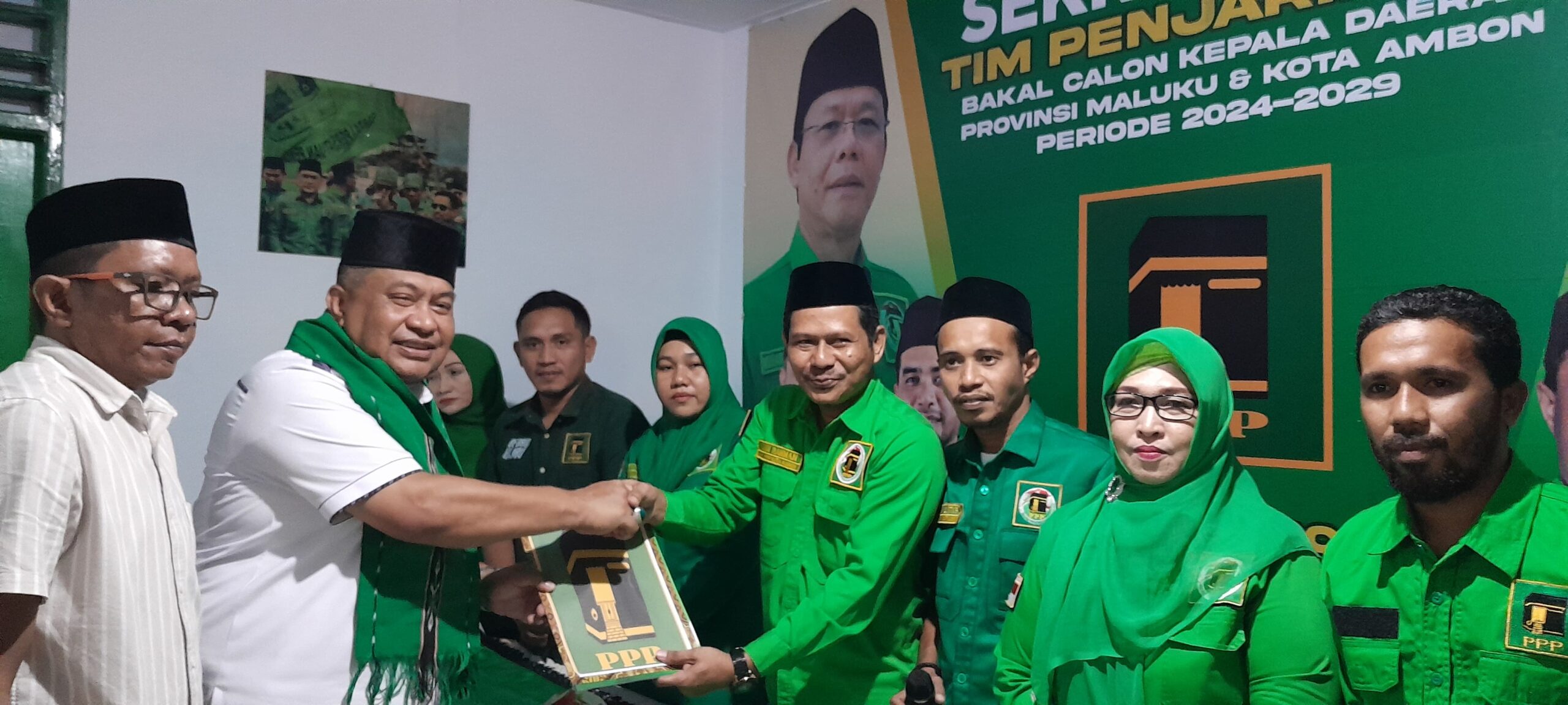Ambon, Nusainanews.com – Bakal Calon Walikota Ambon, Agus Ririmasse melakukan pengembalian formulir pendaftaran di Kantor DPC Partai Persatuan Pembangunan (PPP) Kota Ambon, Rabu (15/5/2024).