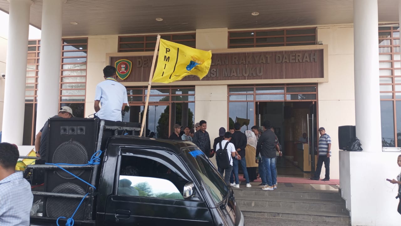 Ambon.nusainanews.com –Puluhan aktifis Persatuan Mahasiswa Islam Indonesia (PMII) cabng Ambon, bersama sejumlah Pedagang melakukan aksi demonstrasi di depan Kantor Dewan Perwakilan Rakyat Daerah (DPRD) Provinsi Maluku, Karang Panjang (Karpan) Kota Ambon.