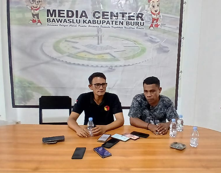 S, Sos. MPA. di-danpingi Kordif Hukum Bawaslu Epsus K. Tomhisa, SH melakukan konprensi Pers terkait pelaporan kuasa Hukum dari tim paslon MANDAT di ruangan rapat kantor Bawaslu Buru jalan dermaga pada sabtu (7/12/2024)