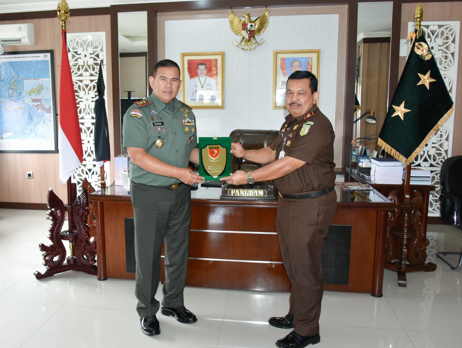 Ambon Nusainanews.com- Pangdam XVI/Pattimura Mayjen TNI Syafrial PSC., M.Tr.(Han)., menerima kunjungan dari Kepala Kejaksaan Tinggi (Kajati) Maluku Edward Kaban beserta Stafnya, di Ruang kerja Pangdam, Senin (23/10/2023).