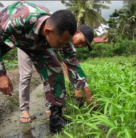 Serda Yusran Gatin disamping mendapat tugas pengerjaan program TMMD, ia meluangkan waktunya membantu warga setempat memanen Kangkung. Sebelum apel pagi Serda Yusran Gatin bersama personil satgas TMMD lainya menyempatkan membantu warga memanen Kangkung.