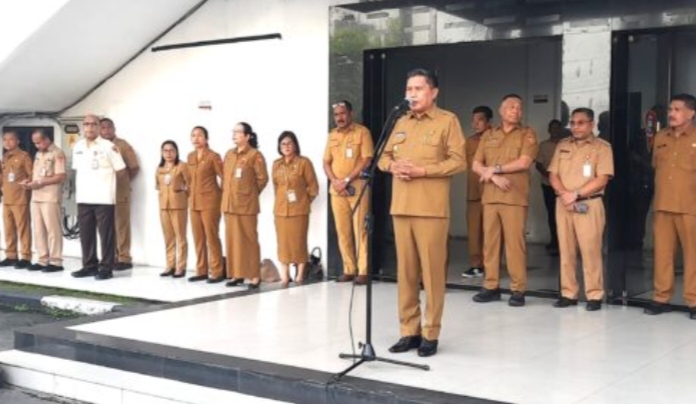 Ambon, Nusainanews.com – Wali Kota Ambon, Bodewin Wattimena, menegaskan komitmennya dalam menjaga ketertiban kota dan kebersihan lingkungan, saat pimpin apel pagi jajaran Pemerintah Kota (Pemkot) Ambon yang dirangkaikan dengan peluncuran program “JIKUBATA” (Menjajakan UMKM di Sudut Balai Kota Ambon), pada Selasa (10/6/2025) di Halaman belakang Balai Kota Ambon.